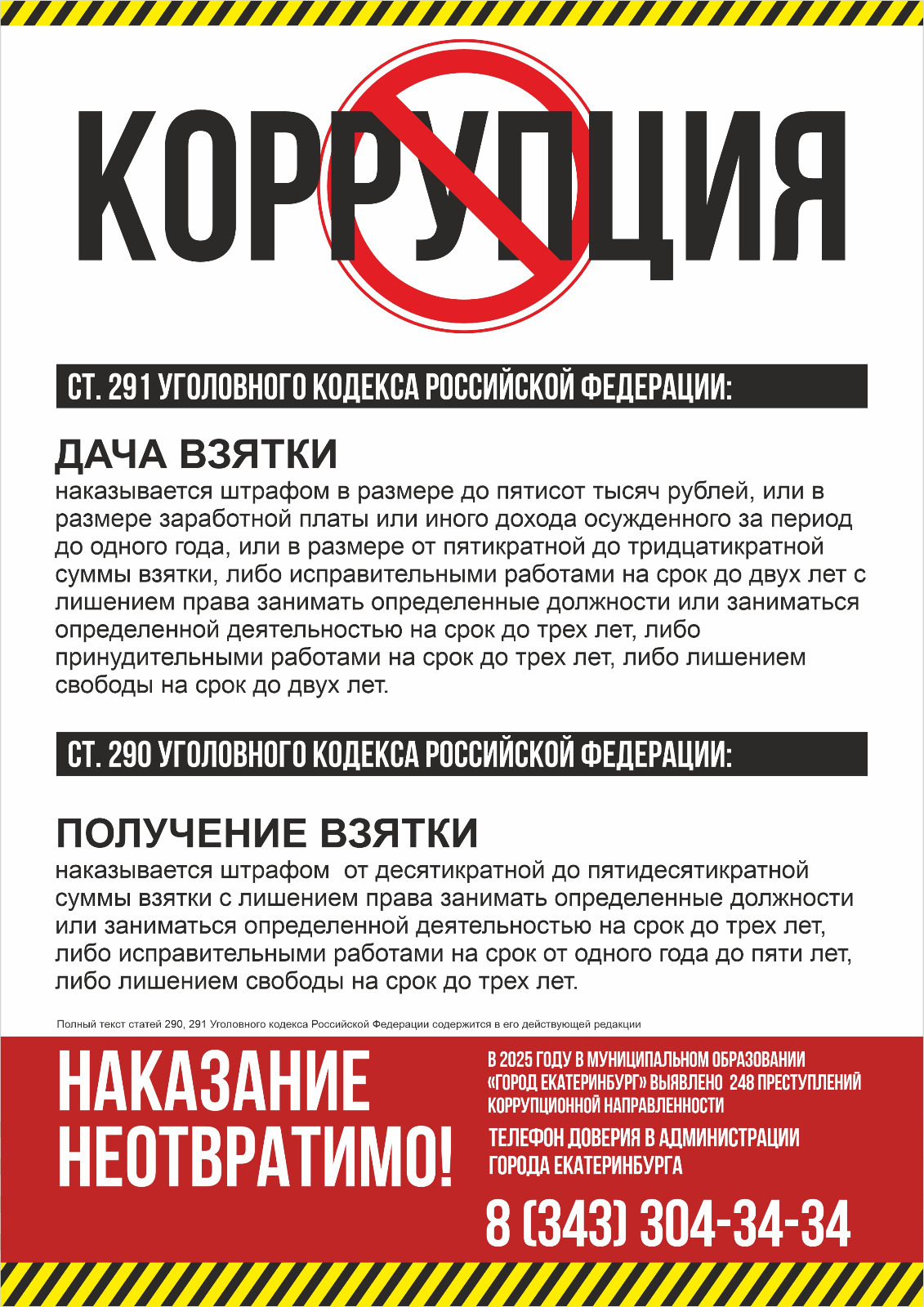 Сообщить о факте коррупции Вы можете по телефонам доверия для приема сообщений о фактах коррупции в Администрации города Екатеринбурга: +7 (343) 304-34-34, +7 (343) 370-72-02.